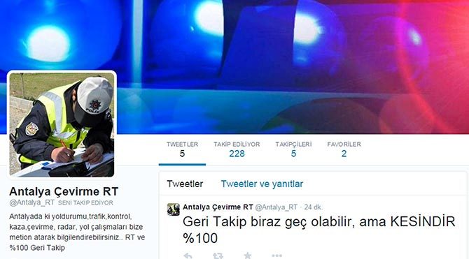 Radar ve trafik çevirmelerinin paylaşılarak, sürücülerin birbirini bilgilendirdiği bu hesaplardan emniyet birimleri de memnun.Sürücülerin kent içindeki caddeler ve karayollarındaki en büyük korkularından olan trafik çevirmeleri ve radar kontrollerine karşı daha önce uygulanan selektörlü uyarının yerini, sosyal medyada Facebook ve Twitter'da oluşturulan hesaplar üzerindeki haberleşme aldı. Antalya'da günlük ve anlık radar ve trafik kontrollerine ilişkin oluşturulan bu hesaplar aracılığıyla sürücüler nerede, hangi saatte kontrol varsa birbirini haberdar ediyor.