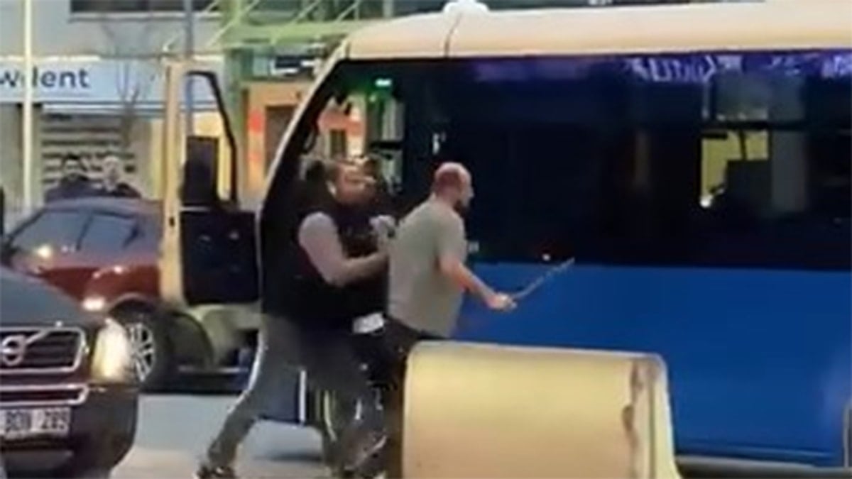 Elinde sopayla hafif ticari aracından inen sürücü, minibüs şoförüne saldırdı. Kavga çevredeki kişilerin araya girmesiyle son buldu.