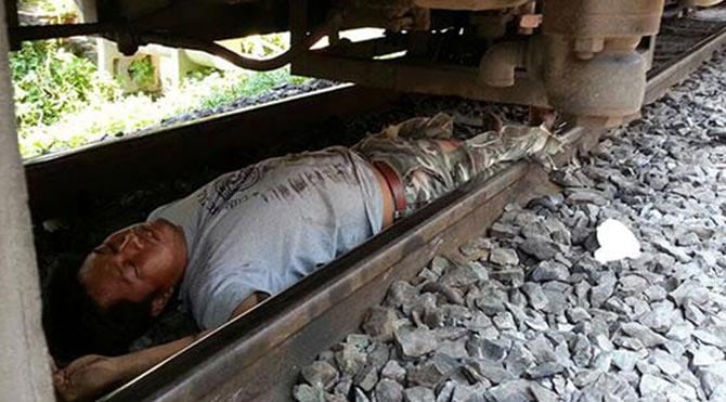 Tayland’ın Nakhon Sawan şehrinde 35 yaşındaki bir adam intihar etmek için trenin önüne atladı ama burnu bile kanamadı ve sadece bir kaç küçük incinmeyle olayı atlattı.