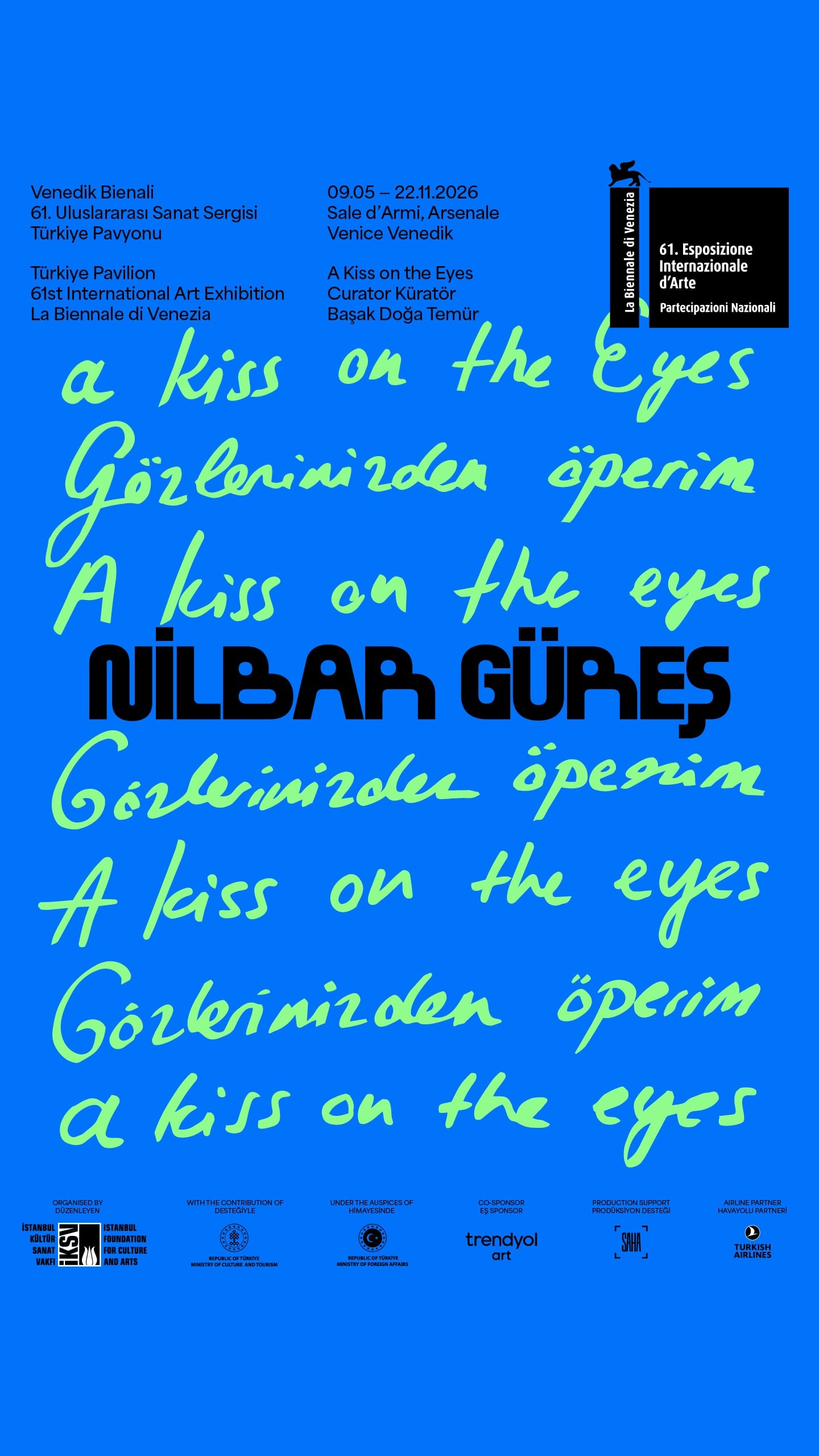 İstanbul Kültür Sanat Vakfı’nın (İKSV) koordinasyonundaki Türkiye Pavyonu, bu yıl sanatçı Nilbar Güreş'in “Gözlerinizden Öperim-A Kiss on the Eyes” adlı sergisine ev sahipliği yapacak. Başak Doğa Temür’ün küratörlüğünü üstlendiği sergide, şiirsel, eleştirel ve nükteli bir yaklaşımla farklı kültürel sembollere, toplumsal eşitsizliklere ve kimlik meselelerine odaklanan çalışmalarıyla bilinen Nilbar Güreş’in Türkiye Pavyonu için ürettiği eserler sanatseverlerle buluşacak.
