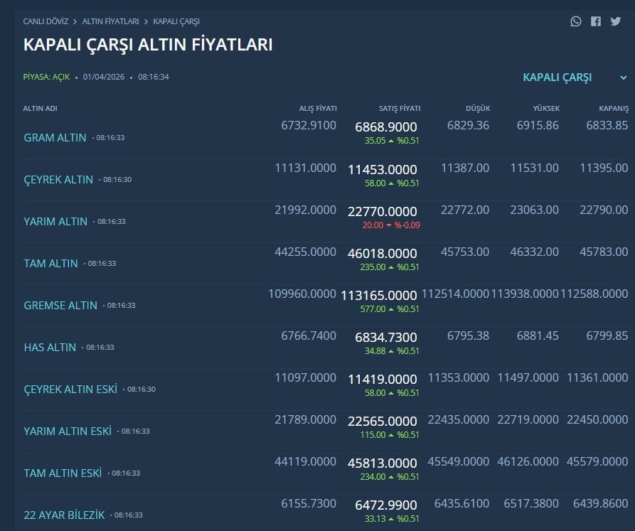 Kapalıçarşı altın fiyatları ile resmi altın fiyatları arasındaki fark devam ediyor. Kapalıçarşı'da gram altın 6 bin 868 liraya yükseldi. İşte Kapalıçarşı altın fiyatları...