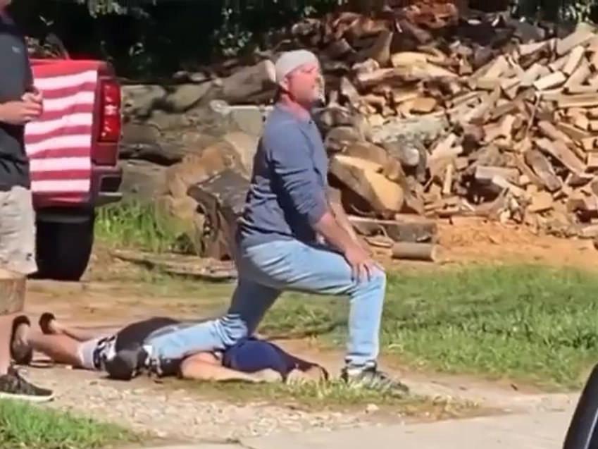New Jersey'de toplanan bir grup, Floyd'un ölüme gittiği anları yeniden canlandırdı. Polis memurunun Floyd'a yaptığı gibi yerde yatan bir kişinin boğazına diziyle baskı uygulayan adam, bölgeden geçmekte olan protestocular aleyhine sloganlar attı.