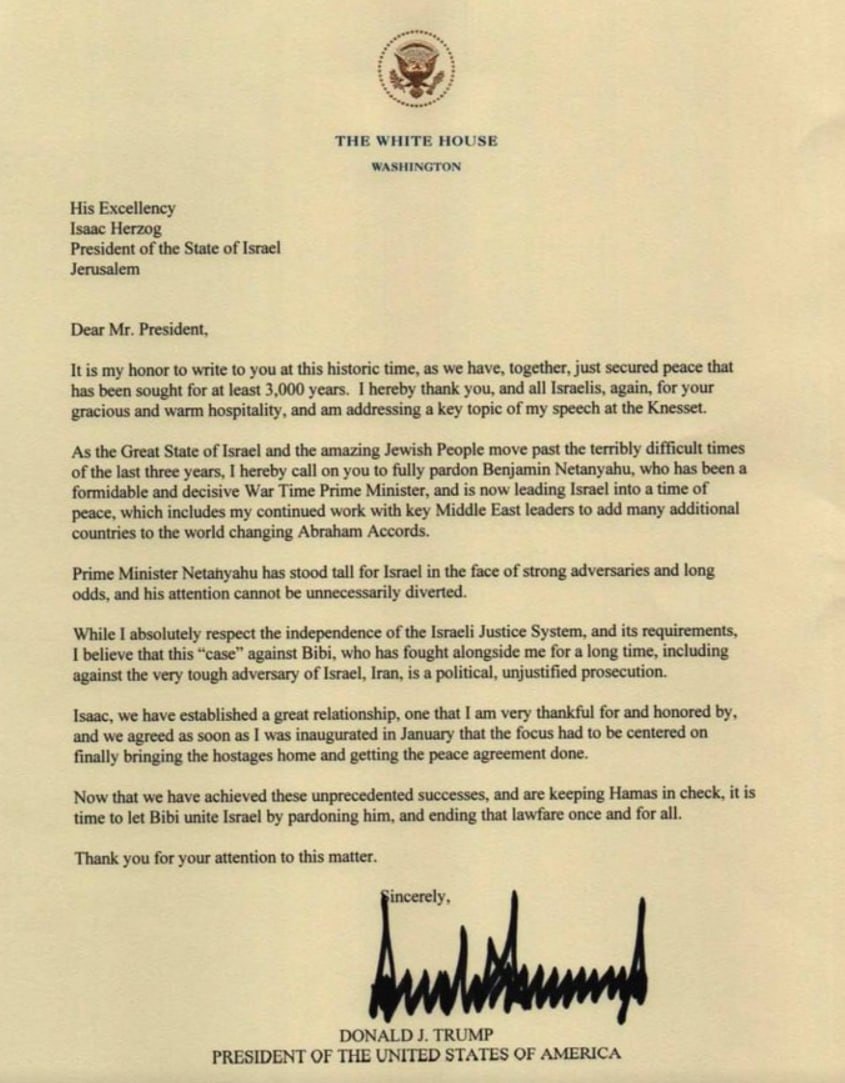 ABD Başkanı Trump, İsrail Cumhurbaşkanı Isaac Herzog'a mektup yazarak yolsuzluktan yargılanan İsrail Başbakanı Netanyahu için af çıkarmasını istedi.