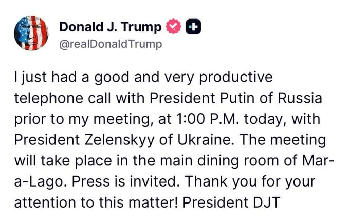 Trump, Putin ile çok iyi ve verimli bir görüşme gerçekleştirdiğini bildirdi.
