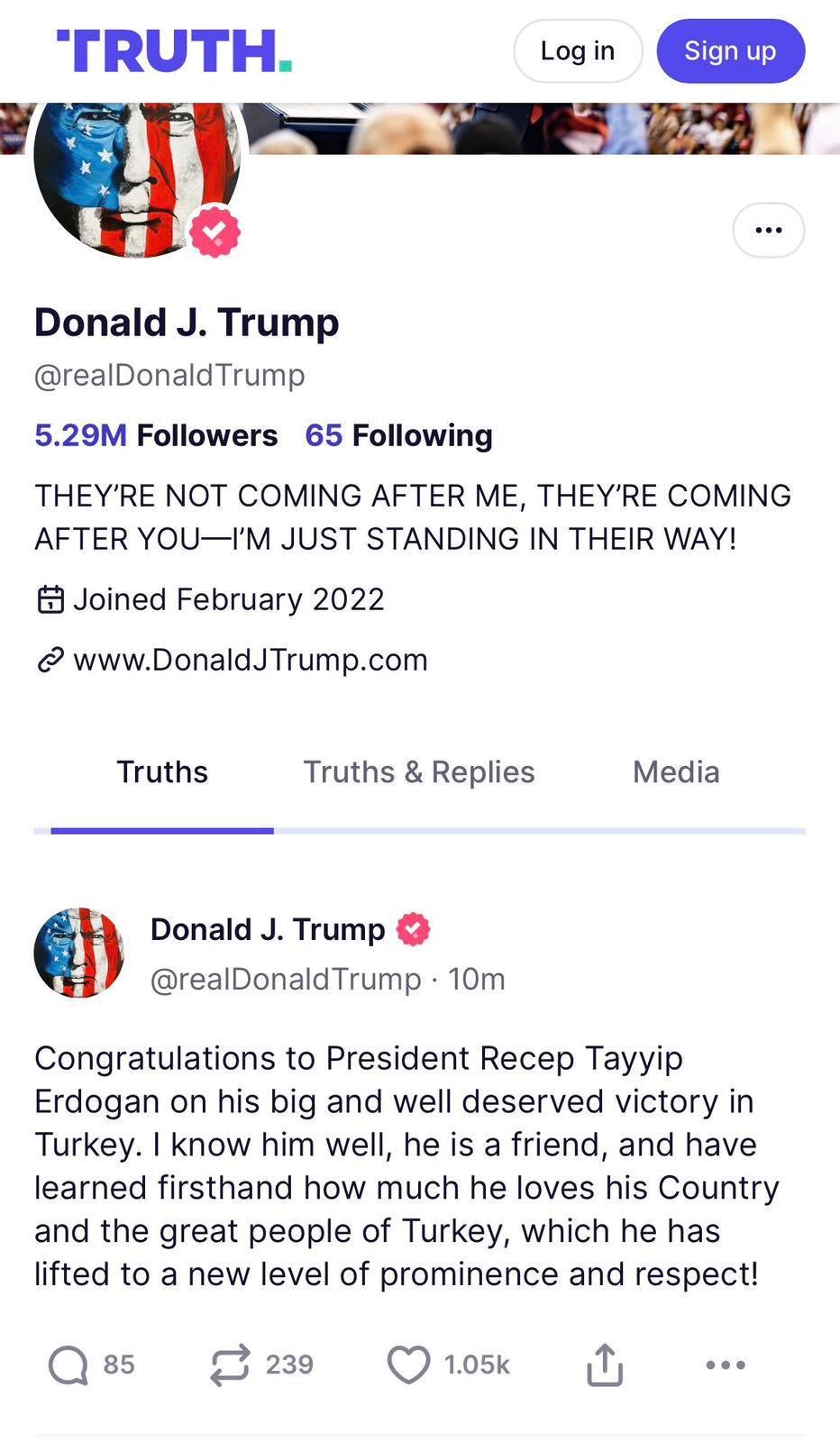 Trump kendi kurduğu sosyal medya platformundan Erdoğan'ı tebrik etti.2024'te yapılacak başkanlık seçimlerine aday olan Trump, kendi sosyal medya sitesi TruthSocial'dan yaptığı paylaşımda, "Türkiye'deki büyük ve hak edilmiş zaferinden ötürü Cumhurbaşkanı Recep Tayyip Erdoğan'ı kutluyorum" ifadesini kullandı.