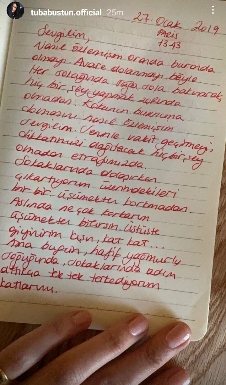 Büyüküstün önceki gün Instagram hesabından günlüğünden parçalar paylaştı. 27 Ocak 2019 tarihli sayfada ise şu sözler yazıyordu: