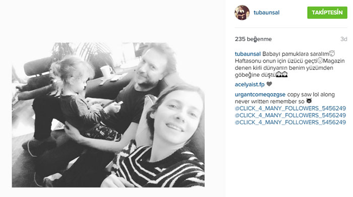 Paylaştığı fotoğrafa Ünsal, "Babayı pamuklara saralım Haftasonu onun için üzücü geçti. Magazin denen kirli dünyanın benim yüzümden göbeğine düştü" notunu düştü.