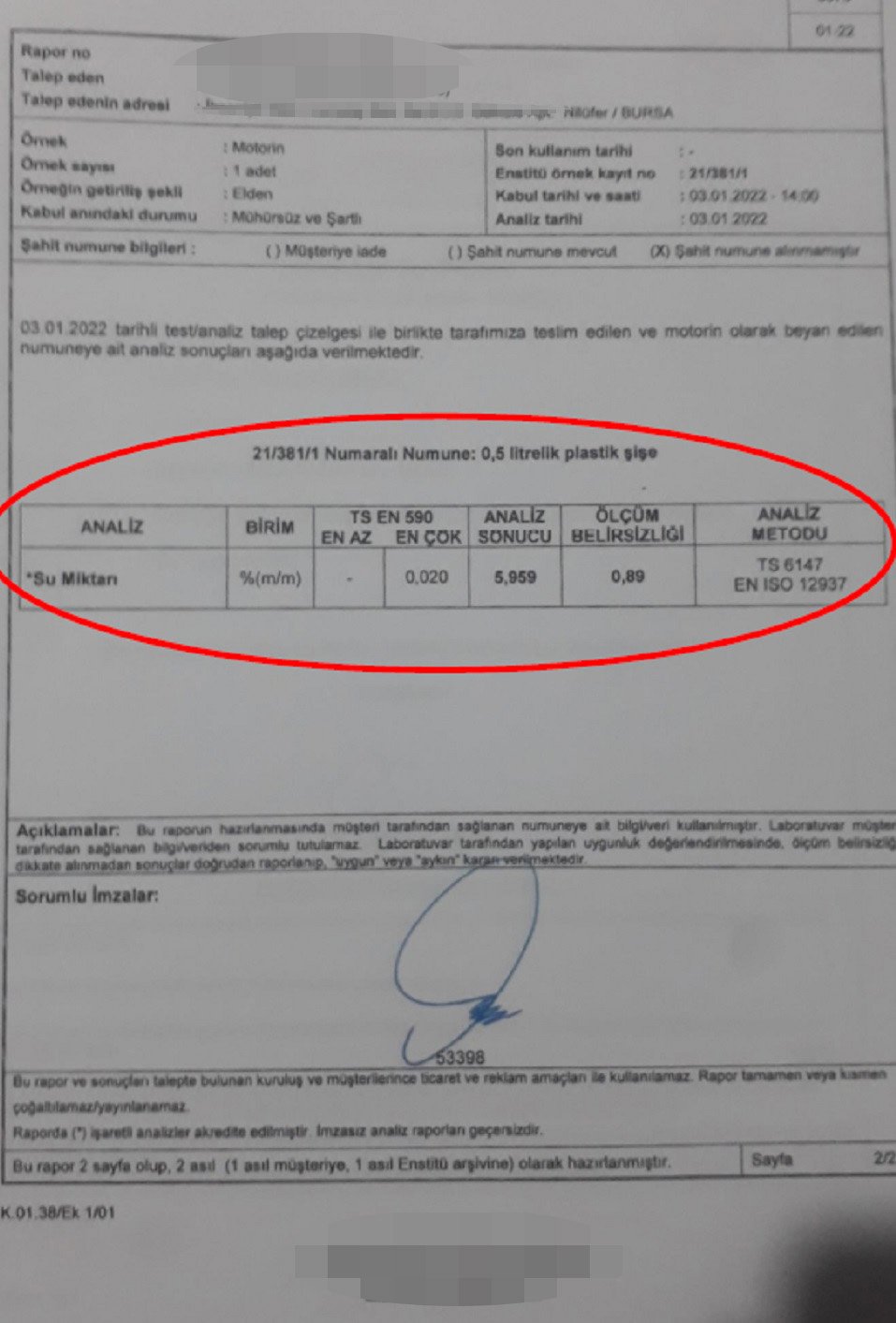 Suç duyurusunda bulunduk, heyet geldi. Aracın deposundaki yakıttan numune aldılar. Alınan numuneler teste gönderildi. Test sonucunda mazotun içerisinde yüksek miktarda su çıktı. Şu an araç serviste. Yaklaşık 70 gündür araç serviste.