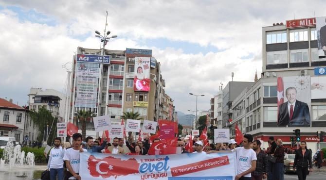 Aydın Büyükşehir Belediyesi önünde Nazilli Mehteran Takımı'nın eşliğinde başlayan yürüyüşe AK Parti Aydın İl Başkanı Ömer Özmen ile birlikte yaklaşık 300 kişi katıldı. Yürüyüşe katılanlar, ellerinde dövizler taşıyıp 'Recep Tayyip Erdoğan' sloganları attı. Grup Kent Meydanı'ndan geçerken 'hayır' standında bulunanlar da 'Mustafa Kemal'in askerleriyiz' sloganı attı. İki grup arasına set çeken polis, olası bir gerginliğe izin vermedi.