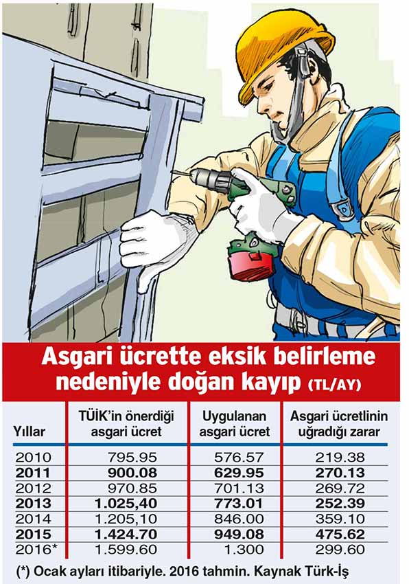 CHP’nin bin 500 liralık asgari ücret vadini yüksek bulan AKP, seçim meydanlarında ilk kez bin 300 liralık vaatte bulunmuştu. Normalde asgari ücret artışlarında enflasyonun üzerine çıkmayan AKP Hükümeti’nin ilk kez ortaya attığı bin 300 liralık ücret karşısında TÜİK’in komisyona nasıl bir rakam sunacağı merak konusu oldu. Geçen yıl, bir işçinin asgari yaşam koşullarını sağlayabilmesi için bin 425 lira maaş alması gerektiğini bildiren TÜİK, bu yıl komisyona tam bin 599 lira 60 kuruşluk asgari ücret sundu. Böylece TÜİK’in yaptığı teknik hesap, hükümetin bin 300 liralık vadinin de asgari geçim şartlarını karşılayamayacağını ortaya koydu.