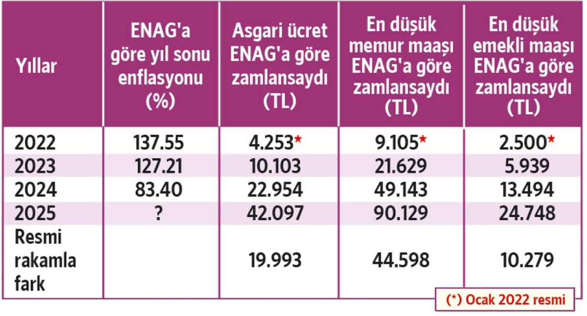 “ENAG’ın verilerinin resmi enflasyon olduğunu varsayalım ve filmi “Nas Ekonomisi”ne geçtiğimiz 2021’in sonuna saralım. 2022’ye girerken asgari ücret 4 bin 253 TL olarak açıklanmıştı. 2022 sonunda ENAG enflasyonu yüzde 137,55 oldu. Yani 2023’te asgari ücretli eğer bu orandan zam almış olsaydı, maaşları 10 bin 103 TL’ye çıkacaktı. Yine bu mantıkla 2024’e girerken asgari ücret çoktan 22 bin 954 TL’ye, yani bugünkü maaşın bile üzerine çıkmış olacaktı. Bu sene ise asgari ücret ne kadar olacaktı biliyor musunuz? Tam 42 bin 97 TL. Yani bugünkü rakamın neredeyse 20 bin lira üzerinde! En düşük memur maaşı bugün 90 bin 129, en düşük emekli maaşı 24 bin 748 lira olacaktı. Grafiğin son satırında bu rakamlarla mevcut rakamlar arasındaki fark yer alıyor. Hepsi neredeyse bir maaş kadar...Bu fark işte kul hakkının ta kendisi!”