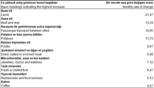 Patates ve bazı yumru bitkiler yüzde 11,73'lük artışla dördüncü olurken, kümes hayvanları eti de yüzde 9,97'lik artışla listede beşinci sırada yer aldı.
