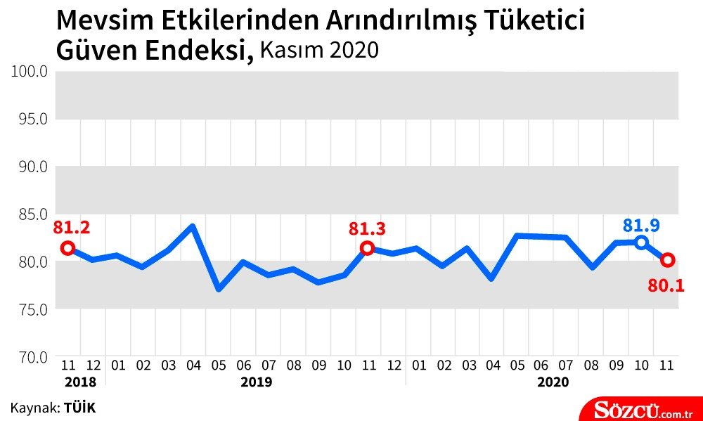 Anket sonuçlarından hesaplanan tüketici güven endeksi 0-200 aralığında değer alabilmektedir. Tüketici güven endeksinin 100'den büyük olması tüketici güveninde iyimser durumu,100'den küçük olması tüketici güveninde kötümser durumu gösteriyor.
