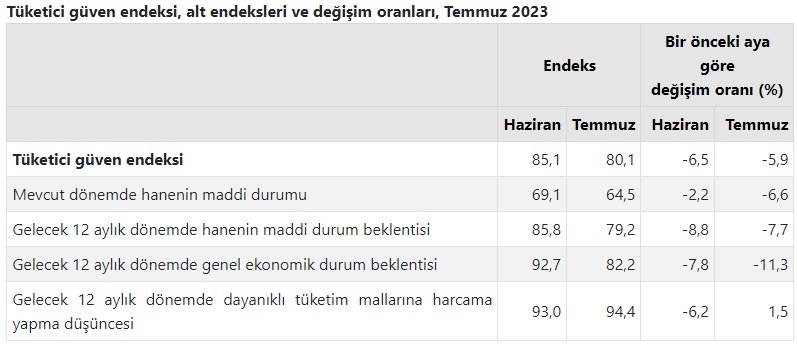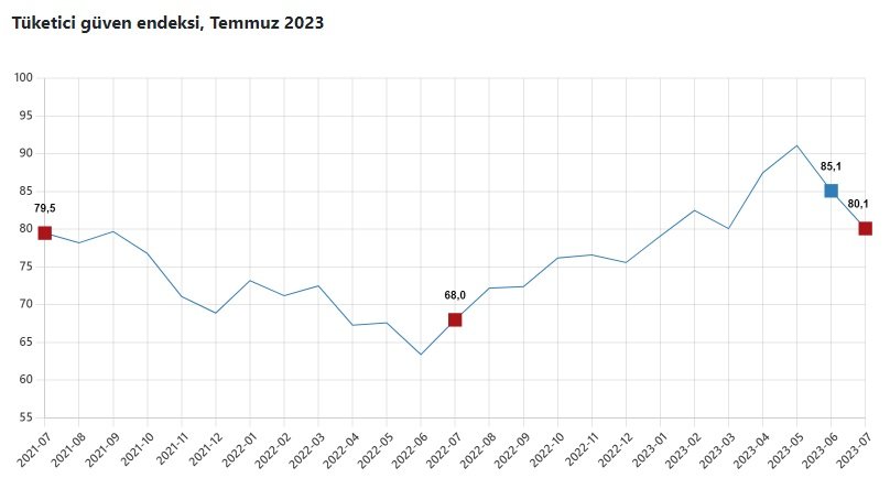 Mart 2023 itibarıyla tüketici güven endeksi 80,1 seviyesinde bulunuyordu. Endeks değeri, 56 aydır, yani cumhurbaşkanlığı hükümet sistemine geçilen Temmuz 2018'den bu yana, 90 seviyesini görmemişti.