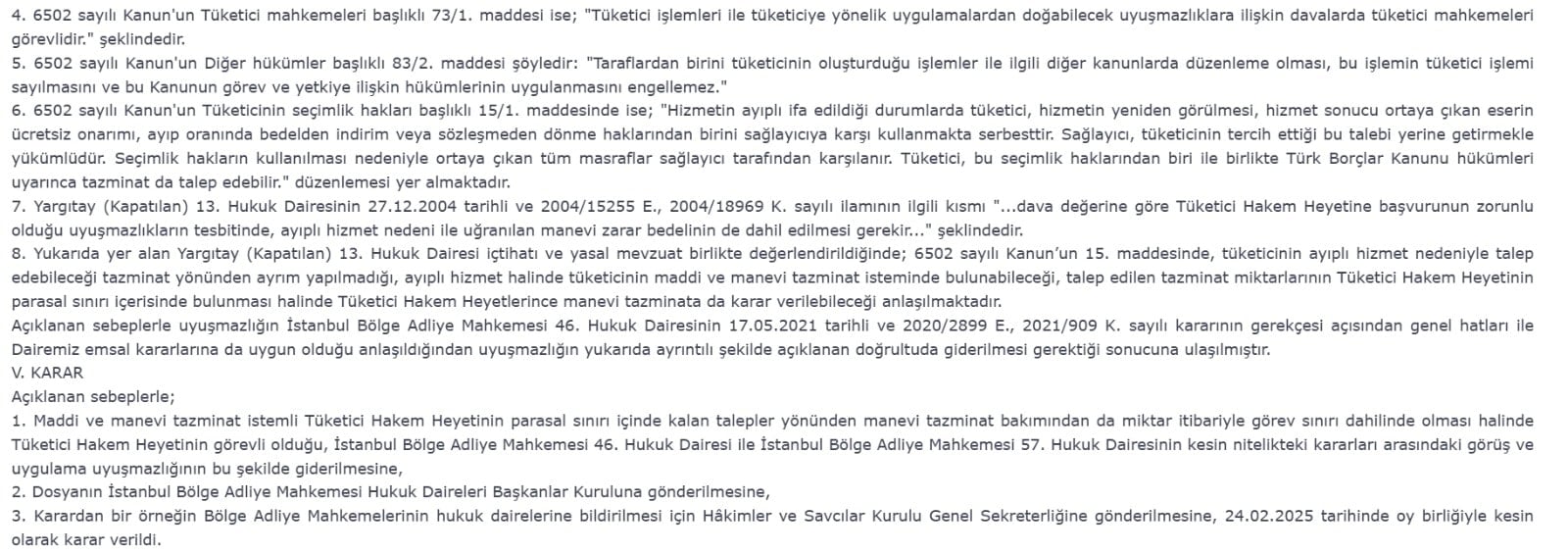 Yargıtay 3. Hukuk Dairesi 2025 yılı şubat ayında, İstanbul Bölge Adliye Mahkemesi 46. Hukuk Dairesi ile 57. Hukuk Dairesi kararları arasındaki maddi ve manevi tazminat istemi ile açılan davalarda miktar itibariyle Tüketici Hakem Heyetinin görevli olup olmadığı konusunda önlerine gelen benzer uyuşmazlıklarda farklı kararlar verilmesi üzerine uygulamadaki uyuşmazlığı tüketici lehine ortadan kaldırmıştır.