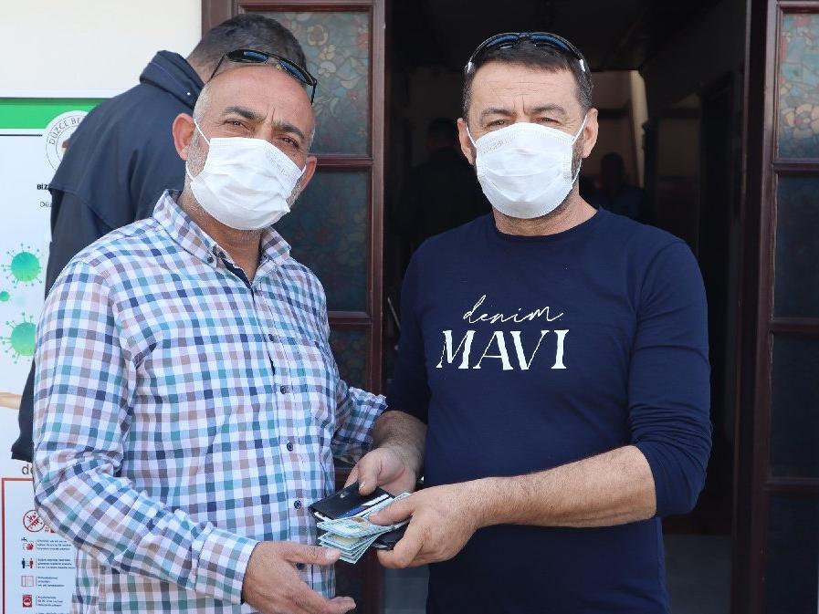 Düzce Anıtpark Meydanında kurulan yöresel ürünler fuarında Hatay yöresini temsil eden ürünleri satan Murat Arslan, bankamatikten çektiği bin 350 dolar ile standına geri dönerken cüzdanını düşürdü. İçinde bin 350 dolar bulunan cüzdanı bulan Salih Metin adlı vatandaş, cüzdanı en yakın zabıta ekibine götürerek teslim etti.