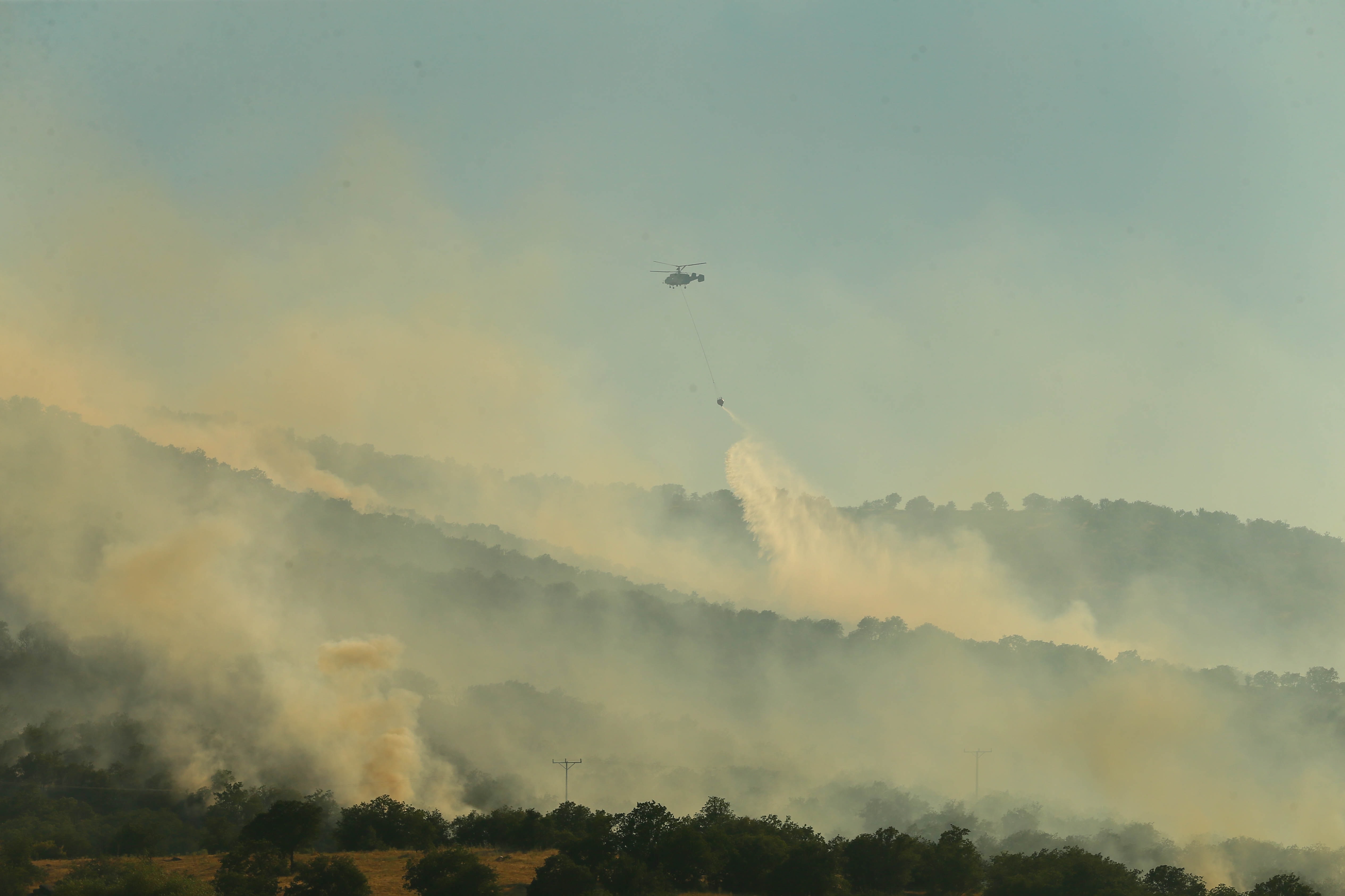 Uşak Eşme'de tarım arazisinde başladığı öğrenilen yangın, rüzgarın da etkisiyle meşelik alana sıçradı. Bölgeye helikopter ve çok sayıda araç gönderildi.