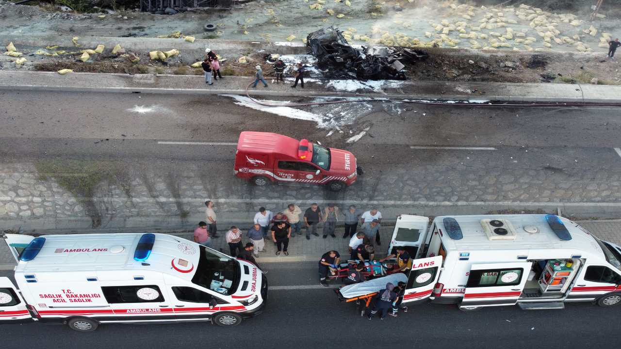 Freni arızalanan TIR önce otobüse çarptı sonra yandı