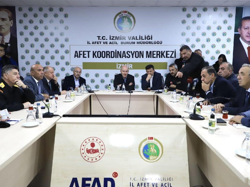 Deprem'den hasar gören yerleri gezen, vatandaşları ziyaret eden İçişleri Bakanı Süleyman Soylu, ardından İzmir Valisi Yavuz Selim Köşger, AFAD Başkanı Yunus Sezer ve ilgili kurum müdürleriyle toplantı yaptı.