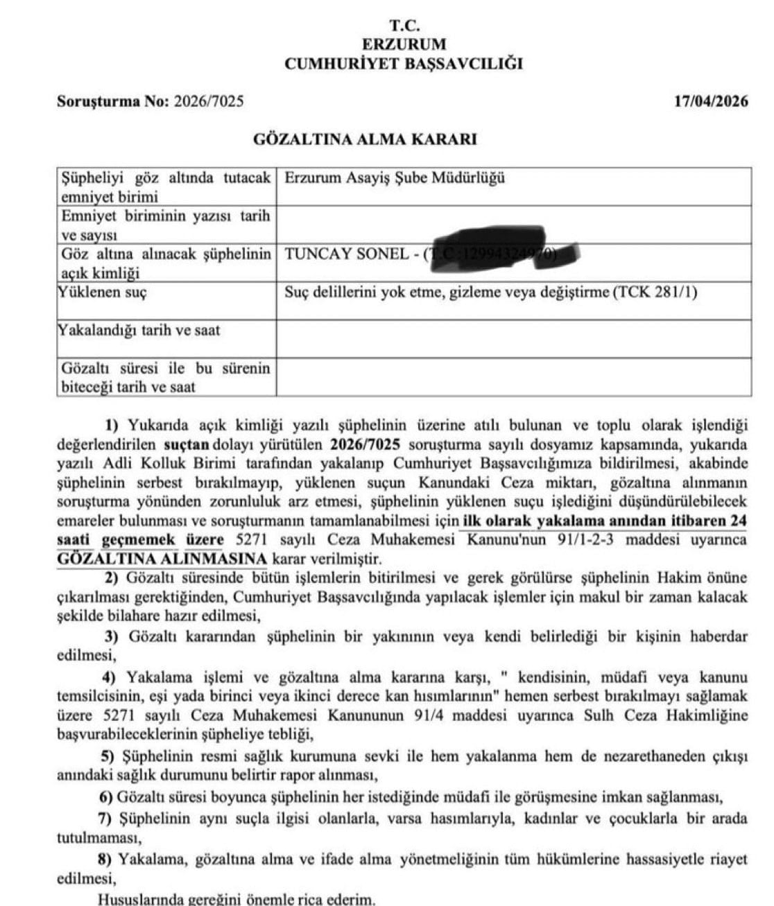 Soruşturmayı ilgili mevzuat gereği Erzurum Cumhuriyet Başsavcılığı yürütecek ve ifadesi de soruşturmanın seyrine göre "şüpheli" sıfatıyla burada alınacak.