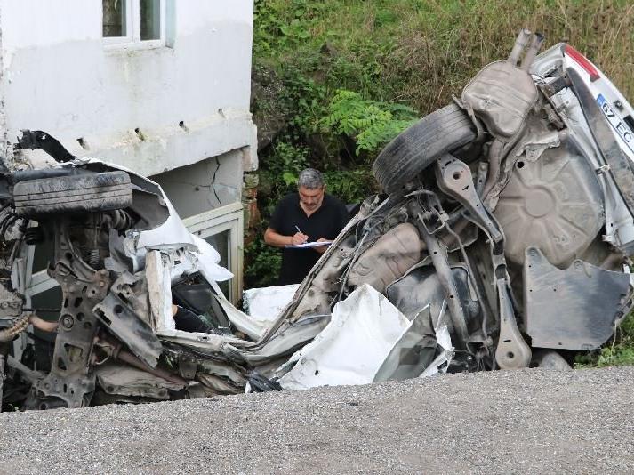 Otomobilin önüne düştüğü evin sahibi Yaşar Bayraktar, "Frene basınca direksiyon hakimiyetini sağlayamadı, önce duvara vurdu sonra evin önüne düştü. Ben de evin içindeydim arabayla göz göze geldim" dedi. (DHA)