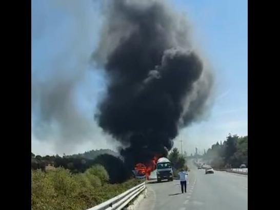 Aydın'ın Kuşadası ilçesinde bir tur şirketine ait midibüs Söke Kuşadası arasında hareket halindeyken alev topuna döndü. Arkadan gelen otomobil sürücülerinin uyarması üzerine güvenlik şeridinde duran midibüsteki yolcular canlarını zor kurtardı.