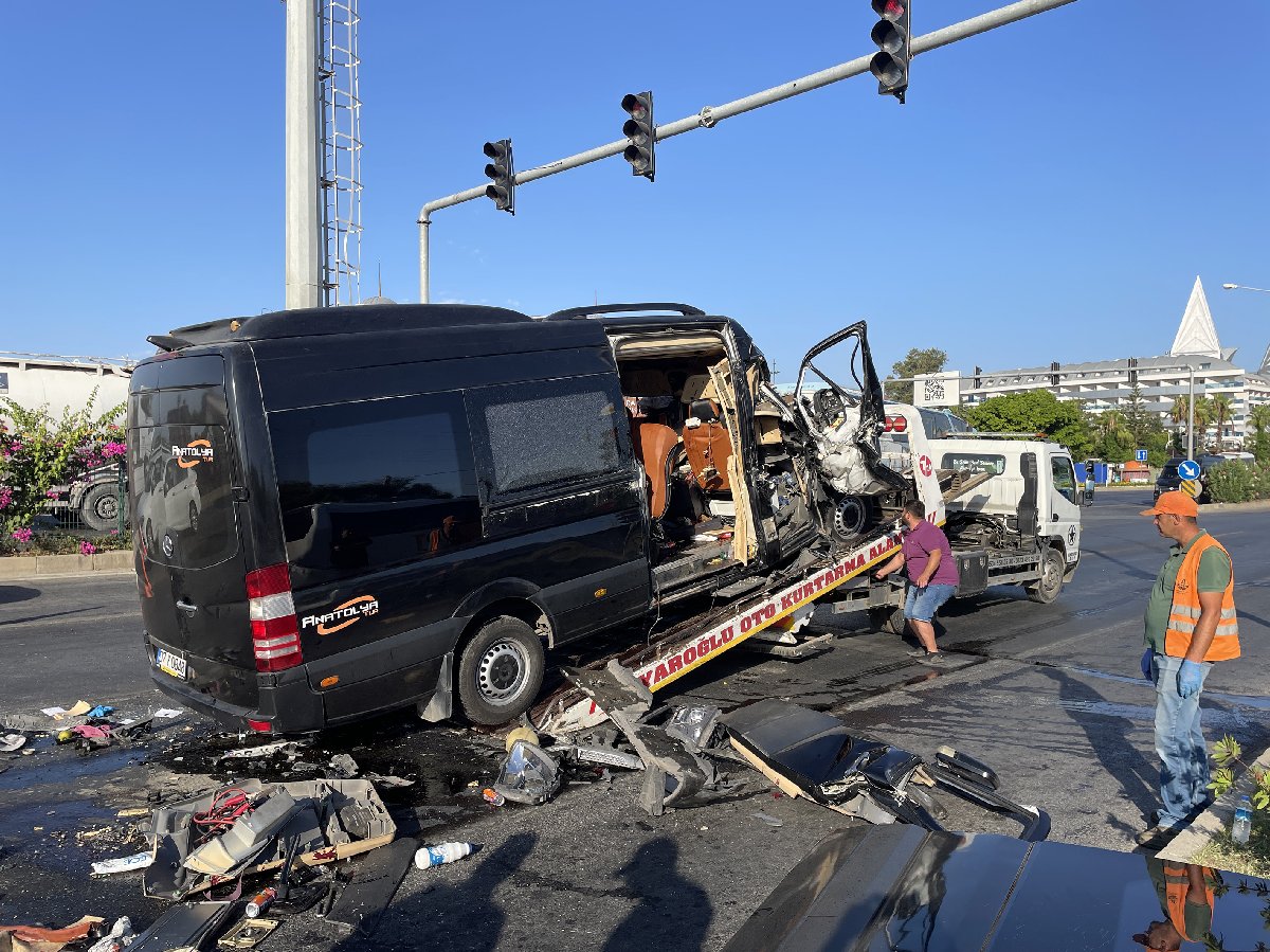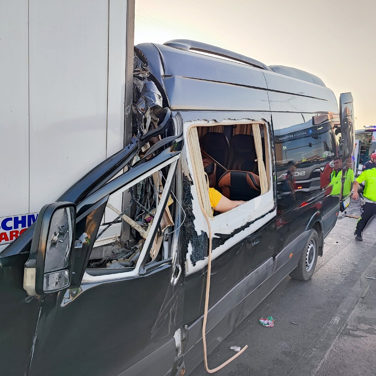 Alanya'nın Okurcalar Mahallesi D-400 kara yolunda Kazakistan uyruklu turistleri taşıyan M.O. yönetimindeki 07 K 0848 plakalı tur minibüsü, trafik ışıklarındaki Ü.P. idaresindeki 34 AHB 93 plakalı TIR'a arkadan çarptı.