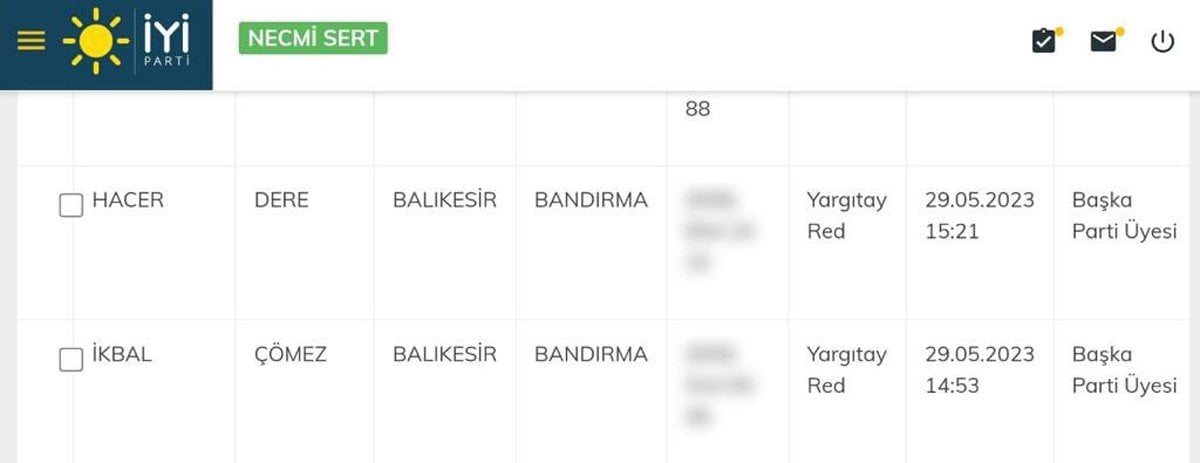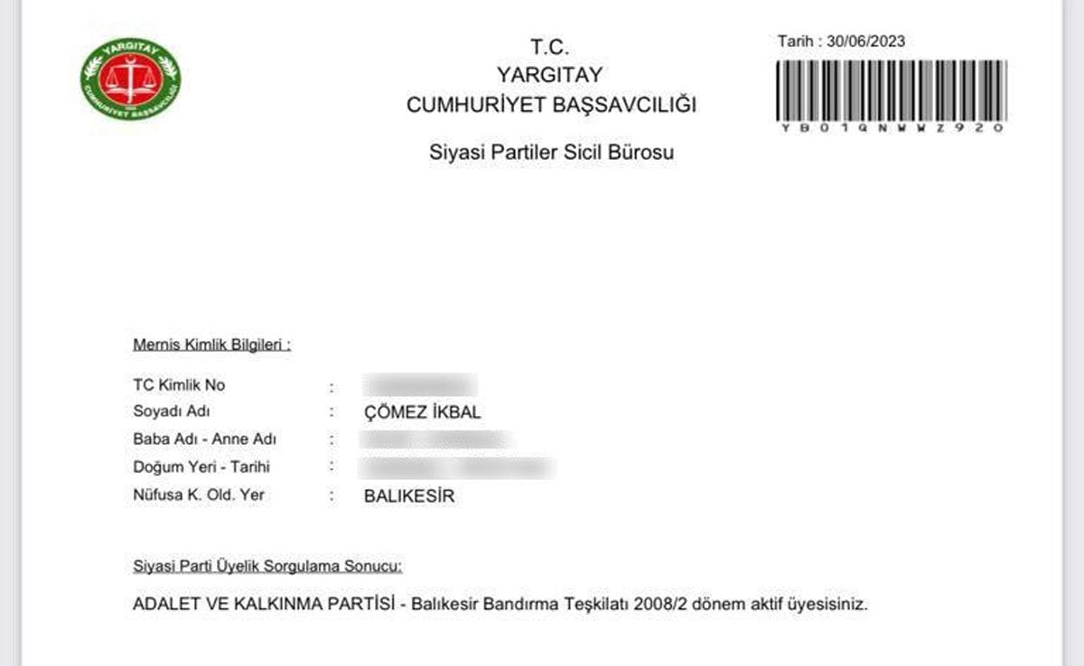 Sosyal medyadan annesi ve ablasının AKP'ye üye yapıldığı belgeyi paylaşan Turhan Çömez, "Annem ve ablam hayatlarında ilk kez bir siyasi partiye üye olmak için başvuru yaptı. Tabii ki, İYİ Parti'ye. Ancak Yargıtay üyeliklerini reddetti. Meğer Ak Parti kimlik bilgilerini ele geçirip sahte üyelik yapmış. Yargıya taşıyoruz" dedi.