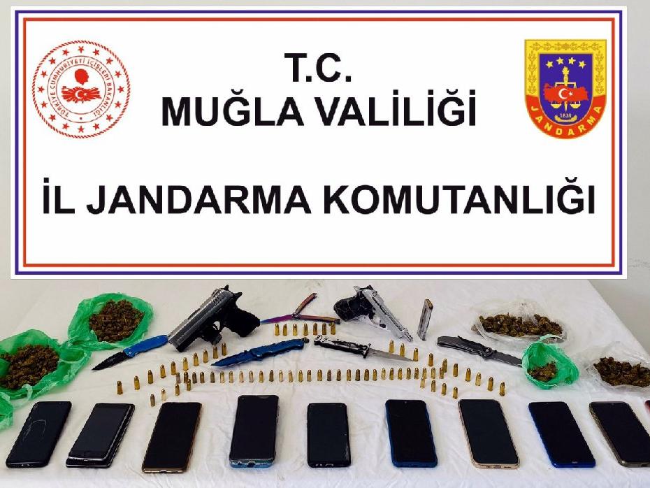 Muğla’nın Fethiye ilçesine bağlı turistik Ölüdeniz Mahallesi Hisarönü Mevkii’ndeki 1 işletme, 1 lojman ve 6 apart odasına Muğla İl Jandarma Komutanlığı ekiplerince yapılan baskınlarda 4 tabanca, 66 fişek,4 sustalı bıçak, bir miktar esrar, bir miktar kenevir tohumu ve 14 adet elektronik sigara ele geçirildi, 10 kişi gözaltına alındı.