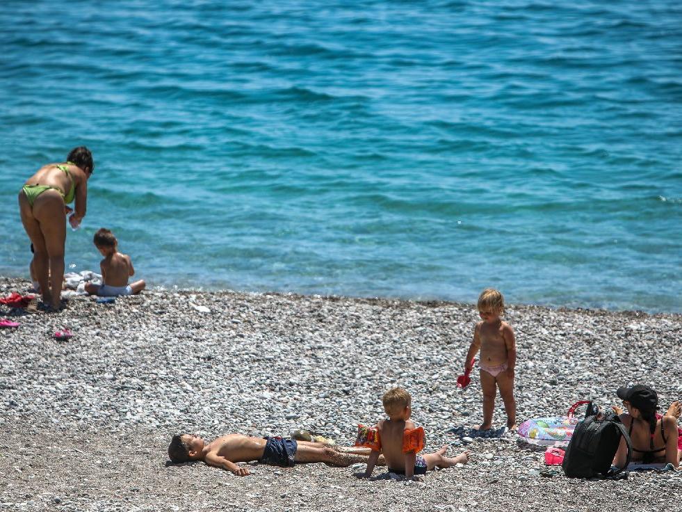 Ramazan Bayramı arifesinde hava sıcaklığı 25 dereceye ulaşınca, kısıtlamadan muaf turistler soluğu Konyaaltı Sahili'nde aldı. Boş sahile gelen turistlerin bazıları sıcaklığı 20 derece olan denize girdi, bazıları ise kumlara uzanarak güneşlendi. (DHA)