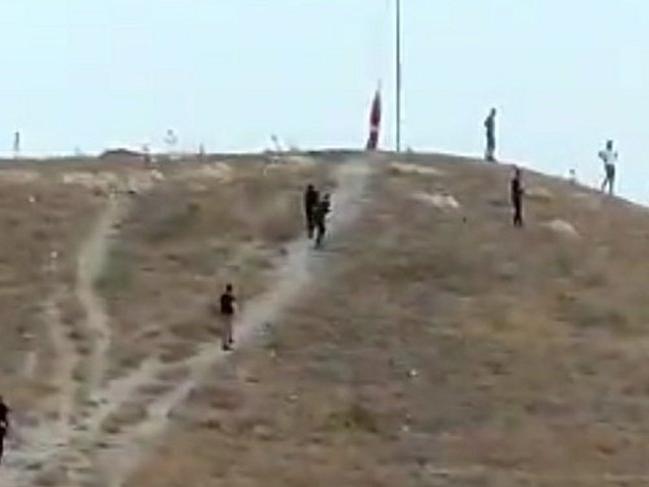Bayrağı yarıya kadar indiren şahıs polislerin gelmesiyle kaçmaya başlıyor. Yokuş aşağı inen şahıs, bir kayanın üzerine çıkarken bazı polisler ise yarıya kadar indirilen bayrağı tekrar göndere çekiyor.