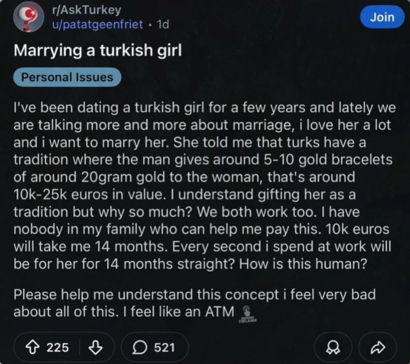 Evliliğe günler kala Türk gelenekleri yüzünden sıkıntı yaşadığını belirten kullanıcı, “Bana, Türklerin evleneceği kadına 5-10 tane bilezik verdiğini söyledi. Bunun ederi 10 ila 25 bin euro arası. Gelenek olmasını anlıyorum ana neden bu kadar çok? Bu nasıl insanca olur? Kendimi ATM gibi hissediyorum.” ifadelerini kullanarak, damat tarafının geline takı alma geleneğine isyan etti.