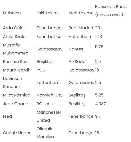 Hisseleri Borsa İstanbul'da işlem gören kulüplerin Kamu Aydınlatma Platformu'na (KAP) yaptıkları bildirimlere göre, Fenerbahçe Arda Güler'in Real Madrid'e 20 milyon avro bonservis bedeli ile transfer olduğu açıkladı. Attila Szalai'nin de 12,3 milyon avro sözleşme fesih bedeliyle Hoffenheim'a transfer olduğu duyuruldu.