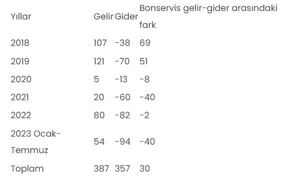 Böylece 2018-2022 yıllarında 333 milyon dolar bonservis geliri elde edilirken, 263 milyon dolar bonservis gideri yaşandı. Böylece bu dönemde yurt dışı bonservis harcamalarında net 70 milyon dolar fazla elde edildi.