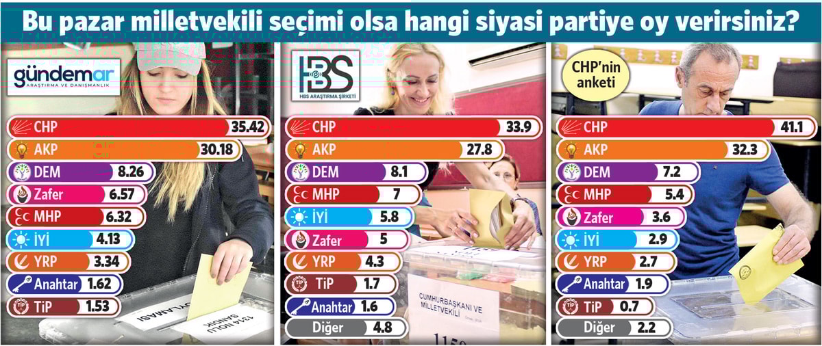 Üç ayrı anket sonucu CHP ile AKP arasındaki farkın giderek açıldığını ortaya koydu. Üç araştırmada da “Bu pazar seçim olsa hangi partiye oy verirsiniz?” sorusunu yanıtlayan vatandaşların tercihi CHP oldu. İktidardaki AKP’nin ise oylarının geçen seçimlere göre eridiği görüldü. Gündemar’ın araştırmasında CHP 35,42 ile ilk sırada yer alırken, AKP’nin oy oranı 30,18. HBS Araştırma’nın çalışmasında ise CHP 33,9, AKP ise 27,8 oy oranına sahip. Ulusal Araştırmanın anketinde ise CHP 41,1 oyla ilk sırada. AKP ise ankete katılanların 32,3’ünün oyunu aldı. Yapılan çalışmalar, iktidar partisinin oy kaybının sürdüğünü gösteriyor.