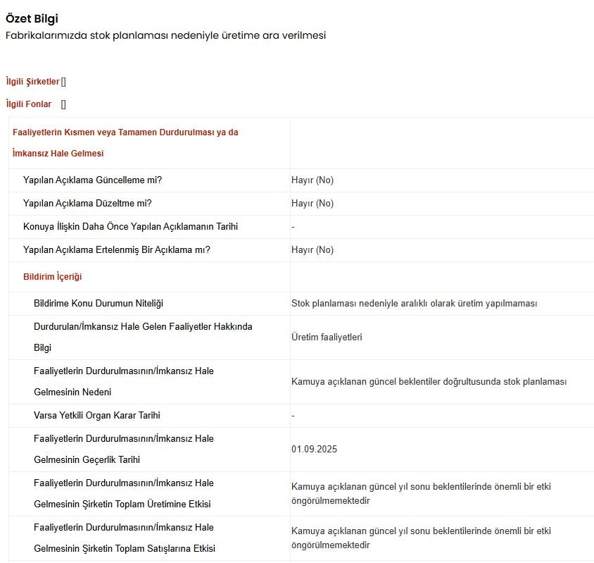 Şirket geçtiğimiz günlerde Ankara ve Sakarya’nın Erenler ilçesindeki fabrikalarda 4 Ağustos – 16 Ağustos 2025 tarihleri arasında toplam 12 işgünü üretimi durdurmuştu.