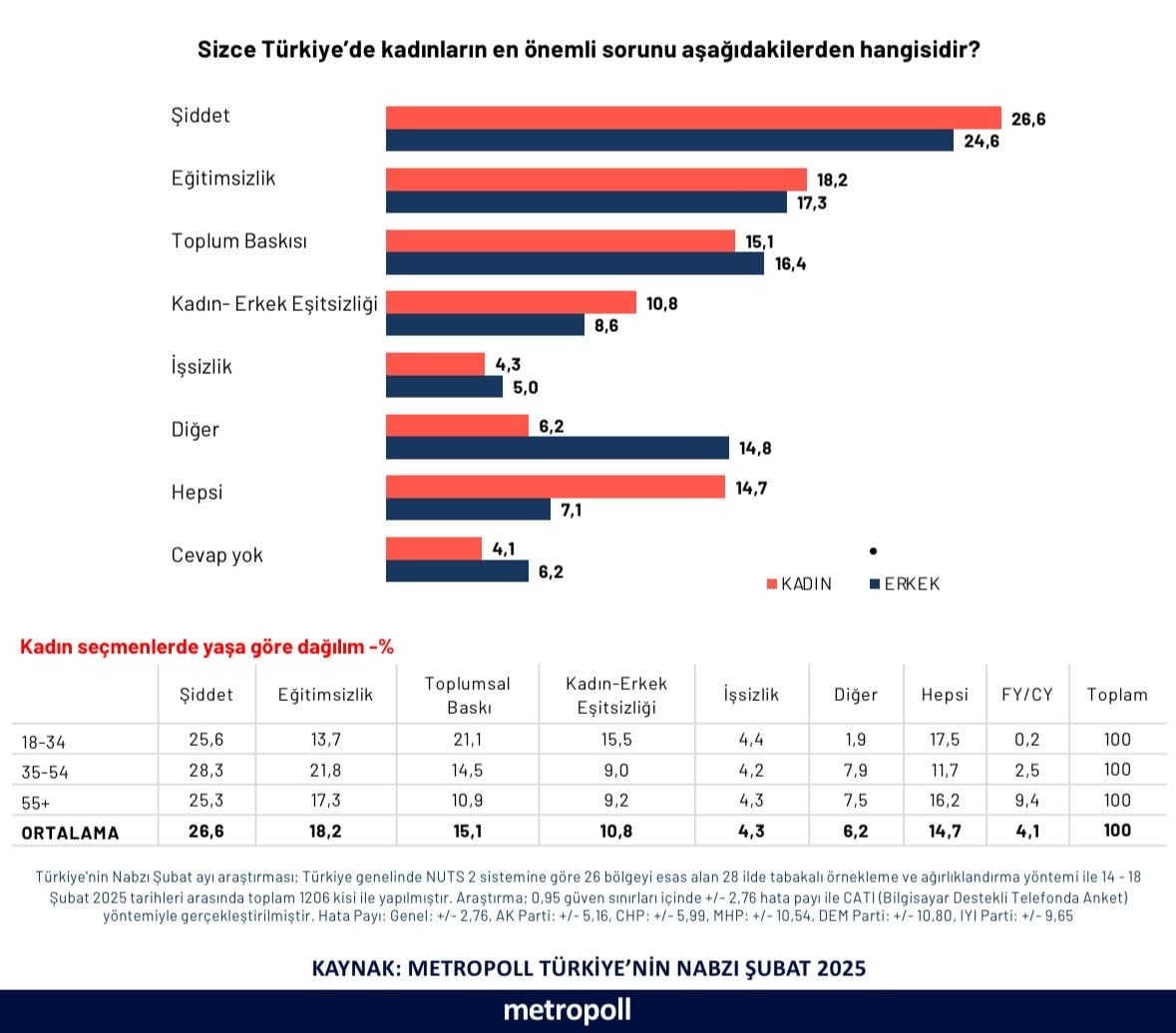 Metropoll Araştırma, 8 Mart Dünya Kadınlar Günü'nde Türkiye'nin Nabzı Şubat ayı araştırmasının sonuçlarını paylaştı. Ankete Türkiye genelinde 26 bölgeyi esas alan 28 ilde tabakalı örnekleme ve ağırlandırma yöntemiyle 14-18 Şubat tarihlerinde 1026 kişiyle yapıldı.