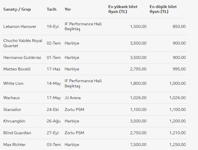 Bu liste içerisinde en düşük bilet fiyatına sahip konser İngiliz-Alman post-punk ikilisi Lebanon Hanover'a ait. IF Performance Hall Beşiktaş'taki bu konserin en düşük bilet fiyatı 850 liradan satılıyor.