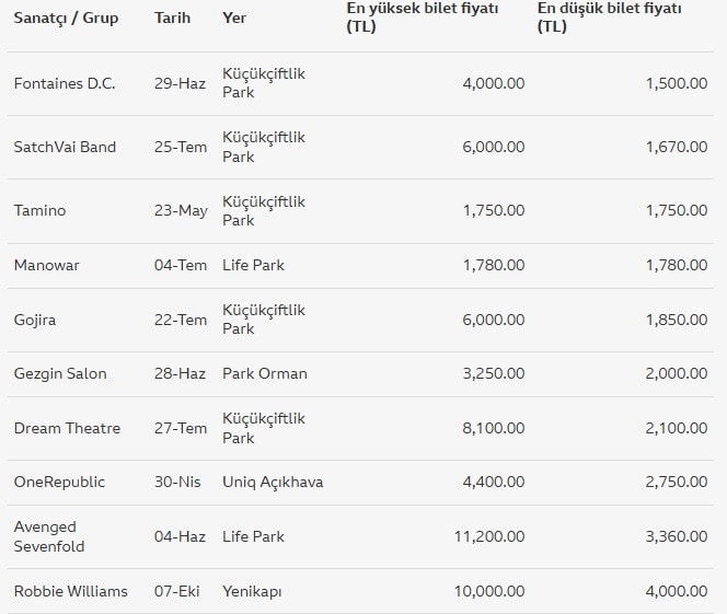 (21 Şubat tarihli fiyatlamalar dikkate alınmıştır. Bazı konserlerin erken dönem satışlarında indirim uygulanıyor)