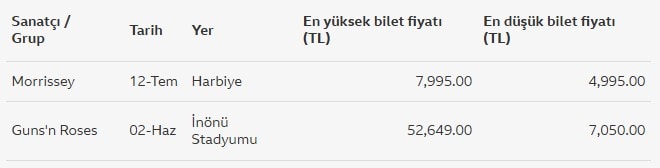 Rock müziğin kültleşen gruplarından Guns'n Roses'ın 2 Haziran'daki İnönü Stadyumu'ndaki konserinin en ucuz bilet fiyatı ise 6.250 TL. Bu, listedeki konserler için en düşük fiyatlı bilet için ödeyebileceğiniz en yüksek ücret. Bu konserin en pahalı bileti ise 52.649 TL. (21 Şubat Cuma günü Biletix fiyatlandırması)