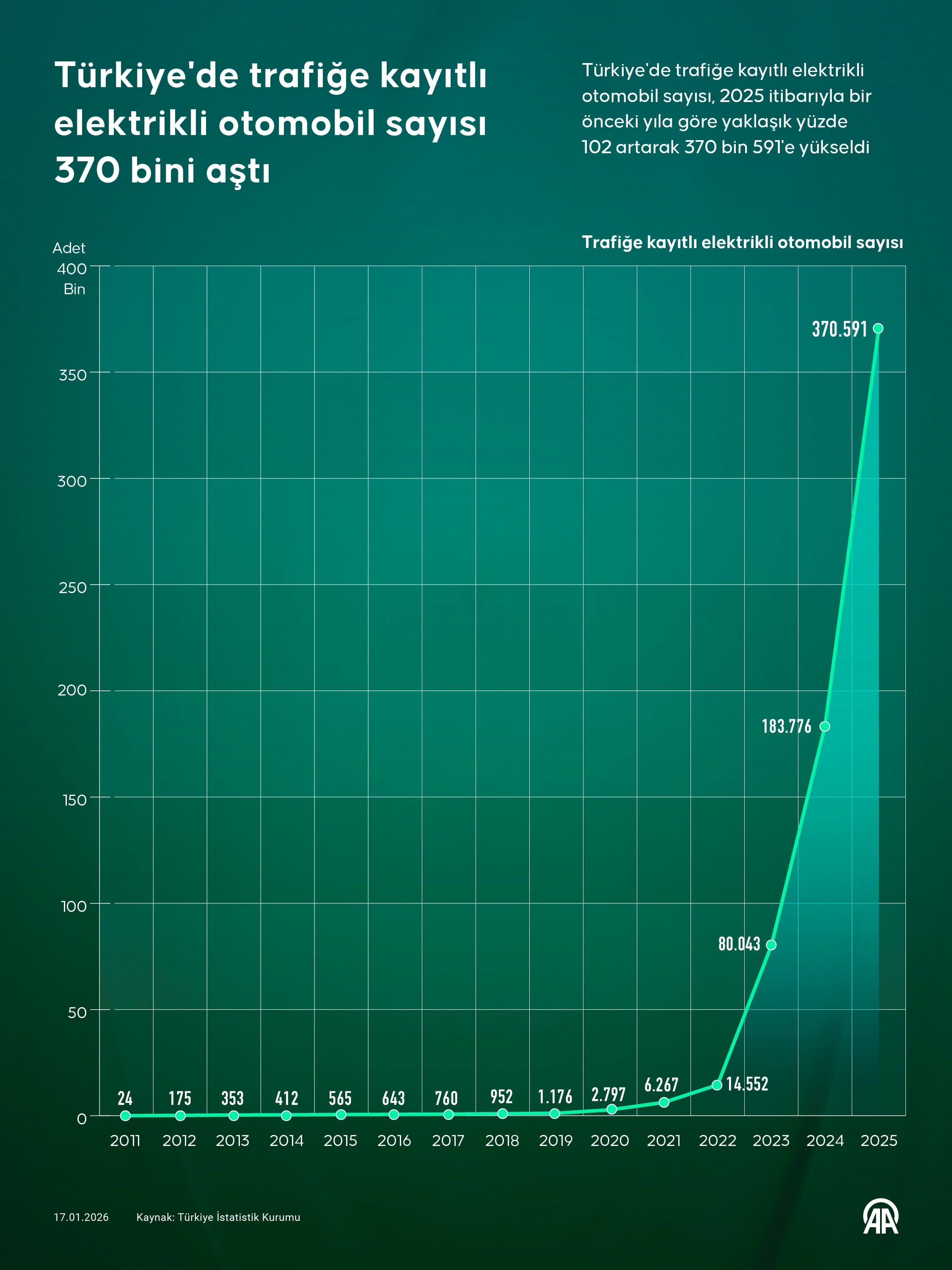 Trafiğe kayıtlı elektrikli otomobil sayısı, 2015'te yalnızca 565 iken, 2024'te 183 bin 776'ya, Aralık 2025 itibarıyla da 370 bin 591'e ulaştı.