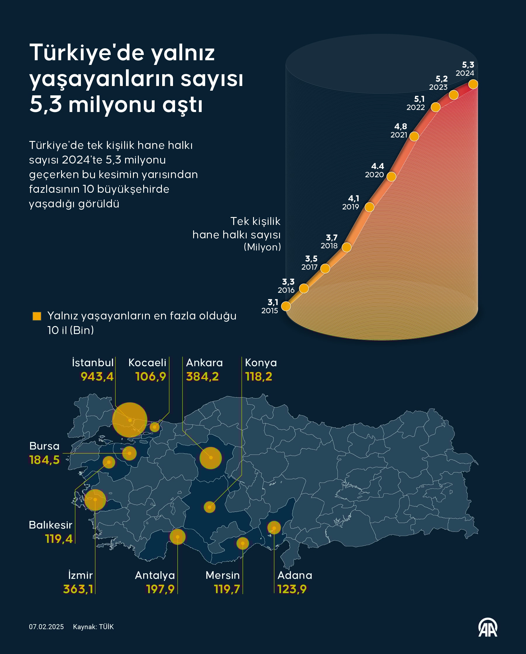 Buna göre, 10 büyükşehirdeki tek kişilik hane halkı sayısı 2 milyon 661 bin 356 olurken, bu sayı ülkedeki yalnız yaşayanların yarıdan fazlası olarak hesaplandı.