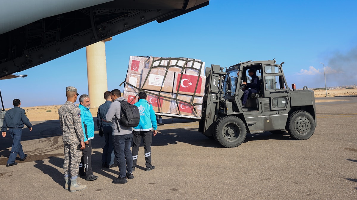 Türkiye'den Gazze'ye ilaç ve tıbbi malzeme taşıyan, 12 uzman sağlık çalışanının da bulunduğu askeri uçak, Kayseri 12. Hava Ulaştırma Ana Üs Komutanlığından Mısır'ın El-Ariş kentindeki havalimanına ulaştı.