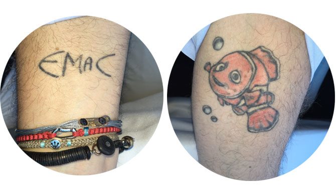 -Sağ kolumdakini büyük kızım çizdi. Çekirdek ailemizin baş harfleri: Esra, Mustafa, Aylin, Caroline. Sol kolumdaki ise balık Nemo.