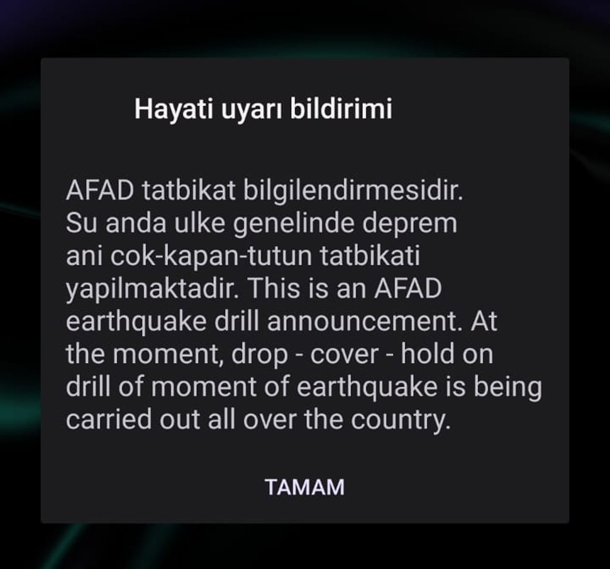Ülke genelinde ilk kez uygulanan tatbikat kapsamında, saat 18.57'de tüm vatandaşların cep telefonlarına gönderilen 'hayati uyarı bildirimi' ile Türkçe ve İngilizce sesli uyarı yapıldı.