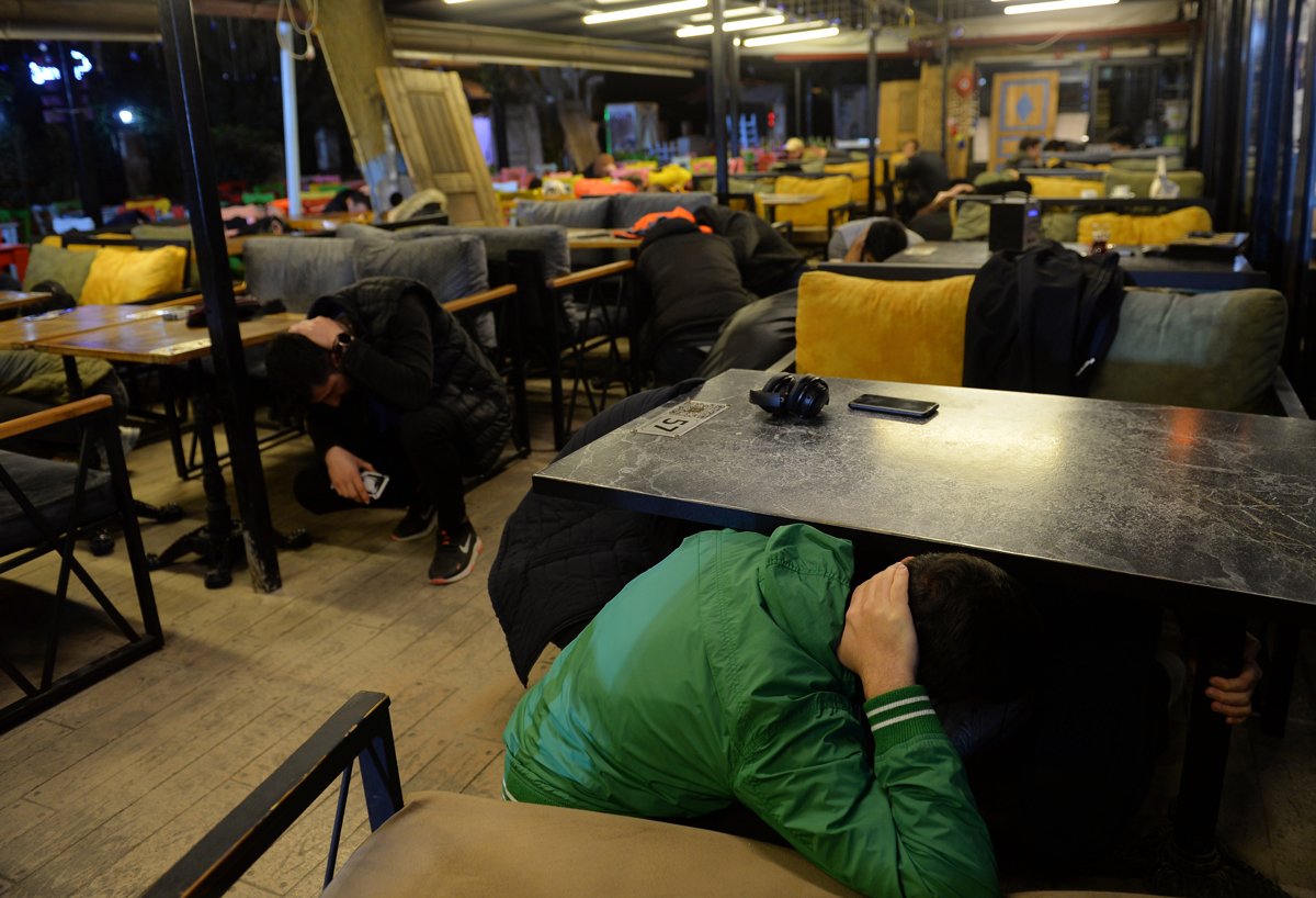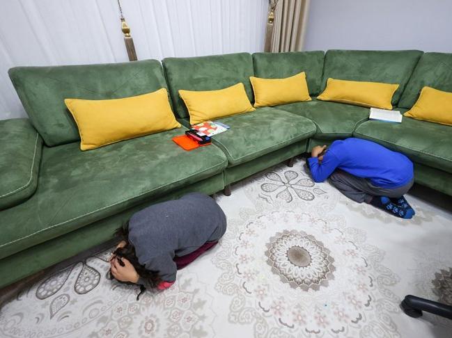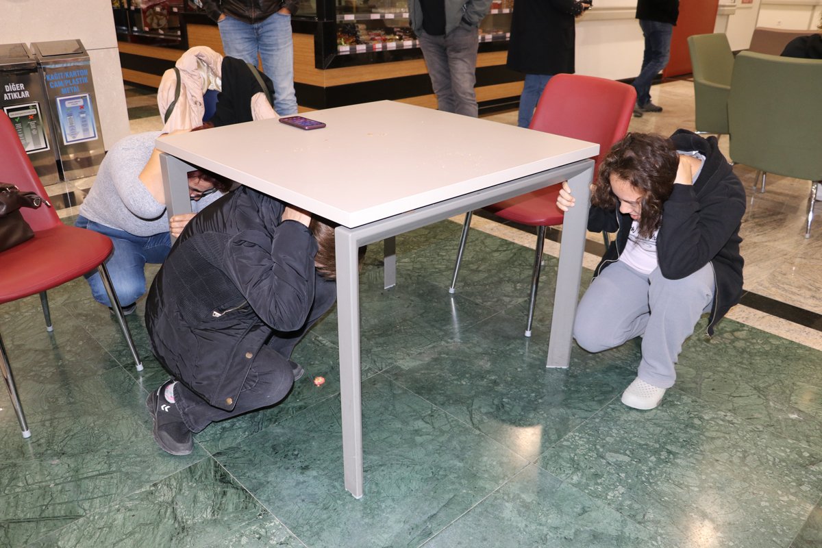 FOTO: AATelevizyonlar ve radyo kanallarından mesaj yayınlandı, vatandaşlar tatbikat sırasında önceden belirlenen sağlam ve güvenilir alanda 'çök-kapan-tutun' hareketini yaptı.