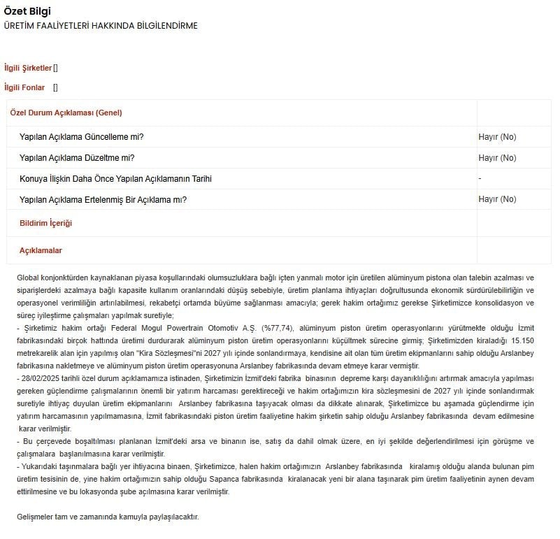 Küresel piyasalarda içten yanmalı motorlara yönelik alüminyum piston talebinin azalması ve kapasite kullanım oranlarındaki düşüş, bu kararın ana gerekçeleri arasında gösterildi. Şirketin hakim ortağı Federal Mogul Powertrain Otomotiv A.Ş., İzmit fabrikasında kiraladığı 15 bin 150 metrekarelik alanı 2027 yılına kadar tamamen tahliye edecek.