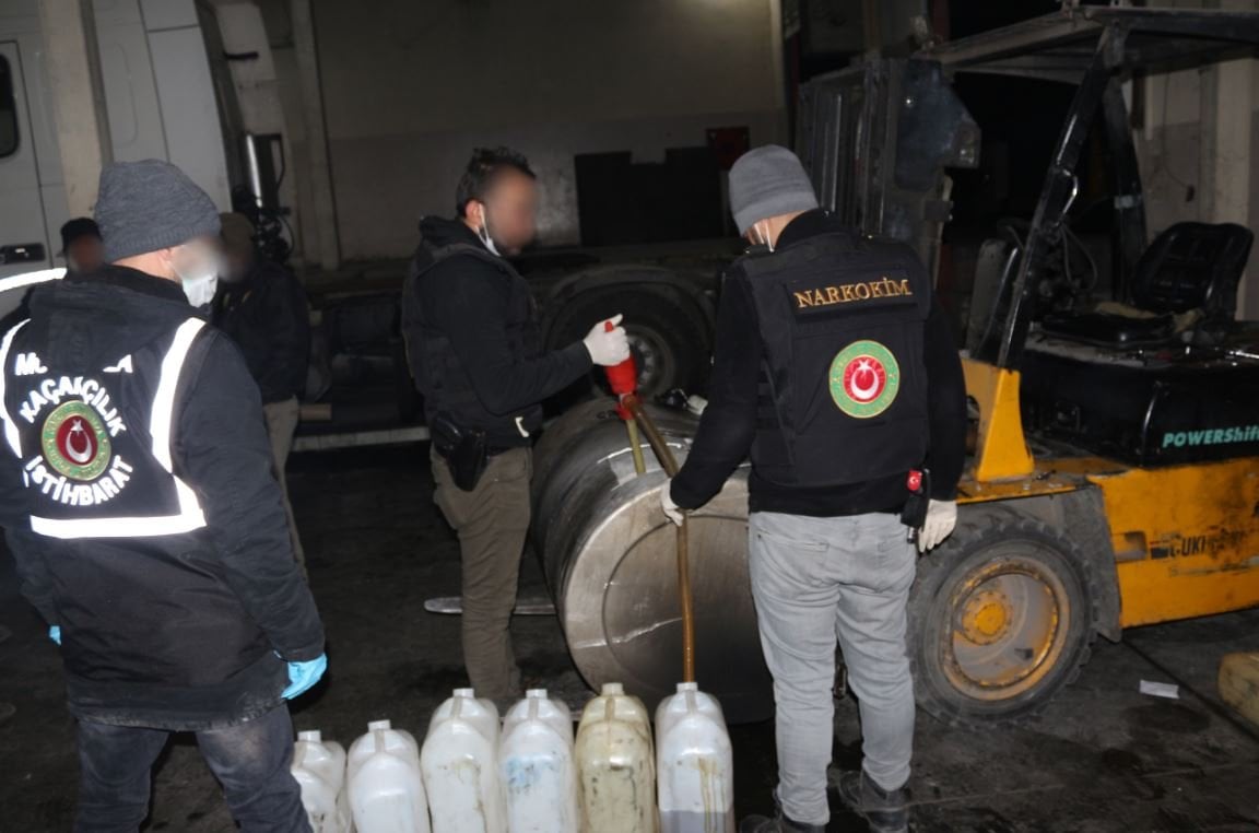 Yakıt deposu içinde gizli bölme oluşturulduğu ve bu bölmenin yakıt izlenimi verilmek istenen farklı sıvı maddeyle doldurulduğu tespit edildi. Sıvı maddeden alınan numunenin uyuşturucu ve kimyasal madde test cihazıyla yapılan analizinde, metamfetamin cinsi uyuşturucu olduğu saptandı. Pompayla depodaki gizli bölmelerden plastik bidonlara aktarılan uyuşturucunun ağırlığının toplam 462.5 kilo olduğu belirlendi.