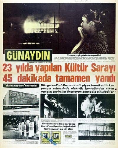 Açılıştan 585 gün sonra 27 Kasım 1970'te İstanbul Kültür Sarayı'nda Arthur Miller'ın "Cadı Kazanı" isimli oyununun sahnelediği sırada yangın çıktı. 23 yılda yapılan bina, kısa sürede tamamen küle döndü. Yangın sırasında bir oyun için Topkapı Sarayı'ndan İstanbul Kültür Sarayı'na getirilen Sultan IV. Murad’ın kaftanı, kılıcı, entarisi, Kösem Sultan'a gönderdiği bir ferman, Hafız Mehmed'in eseri değerli bir Kur'an-ı Kerim de hasar gördü.