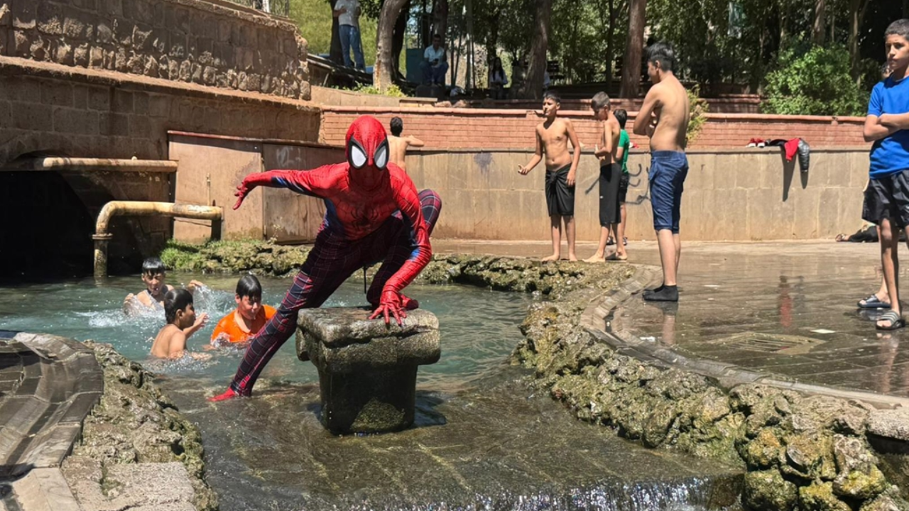 Kahramanmaraş merkezli 6 Şubat 2023'teki depremlerde çocuklara yönelik çalışmaları ile dikkat çeken ve daha sonra Türkiye'yi gezme hayaliyle memleketi İzmir'den 'Örümcek Adam' kostümüyle yola çıkan Ayaz Salih Koç, 67'nci durağı olan Diyarbakır'a geldi. 6 Şubat 2023'te meydana gelen depremlerden etkilenen kente daha önce de gelen ve çadırda kalan çocuklara moral olan Koç, bu kez sıcaklıkların mevsim normallerinin üzerinde seyrettiği kentte sıcaktan bulanan çocuklar ile birlikte Sur ilesindeki tarihi Anzele Parkı'ndaki süs havuzuna girdi.